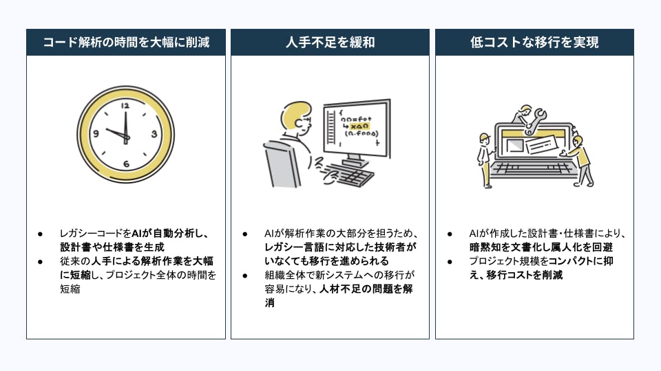 AIを活用したモダナイゼーションの自動化によって、以下の3つのメリットが期待できます。