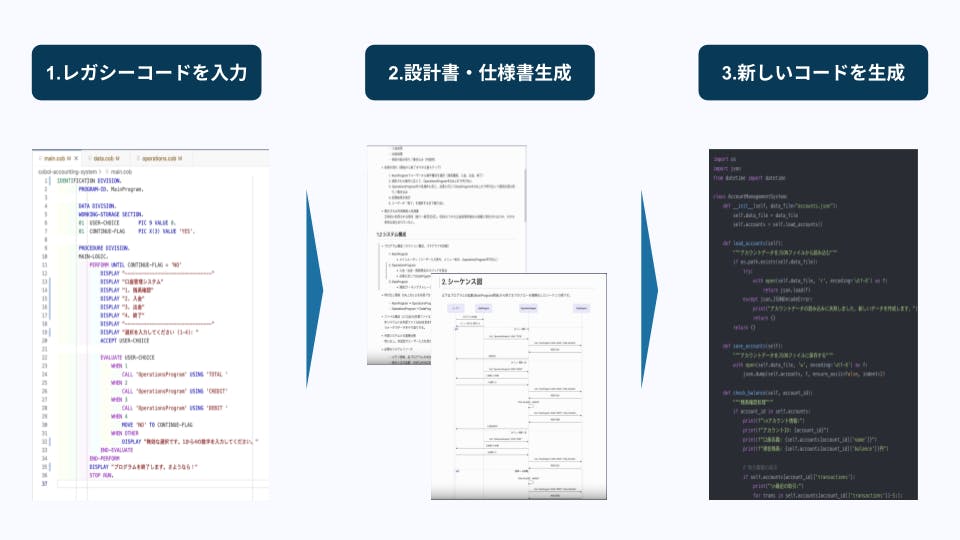 この動画では、AIがCOBOLコードを解析し、設計書や仕様書を自動生成する様子を確認できます。以下の3ステップで進めています。