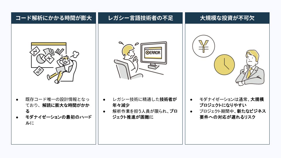 基幹システムを新しい技術環境へ移行する「モダナイゼーション」には、業務継続の安全性やメンテナンス性の向上など多くのメリットがあります。しかし一方で、ドキュメント不足や膨大な時間コスト、移行リスクといった課題も存在します。