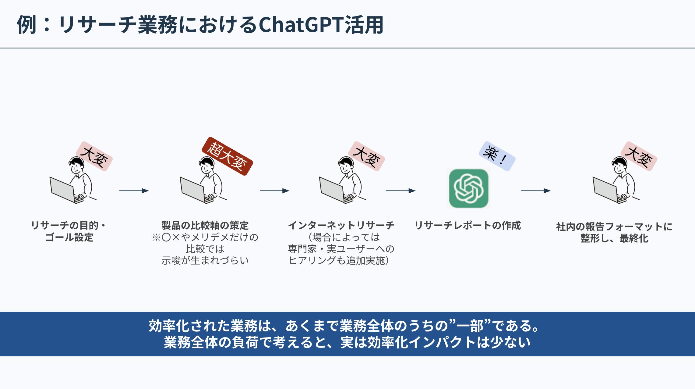 まず多く見られるのが、全体業務の中の一部しかAI活用が進まず、効率化のインパクトが少なくなってしまうケースです。一例として、リサーチ業務におけるChatGPTを活用したレポート作成の効率化について説明します。実際のリサーチ業務は目的設定からインターネット検索、レポート作成、最終化といった多岐にわたるステップがあり、本来であればこの全てを生成AIで代替し、業務全体の効率化を図りたいです。しかし、現状では一部の業務しかChatGPTの活用が進まないケースが多く(今回の例だとレポート作成のみ)、想定よりも効率化のインパクトが少なくなってしまいます。