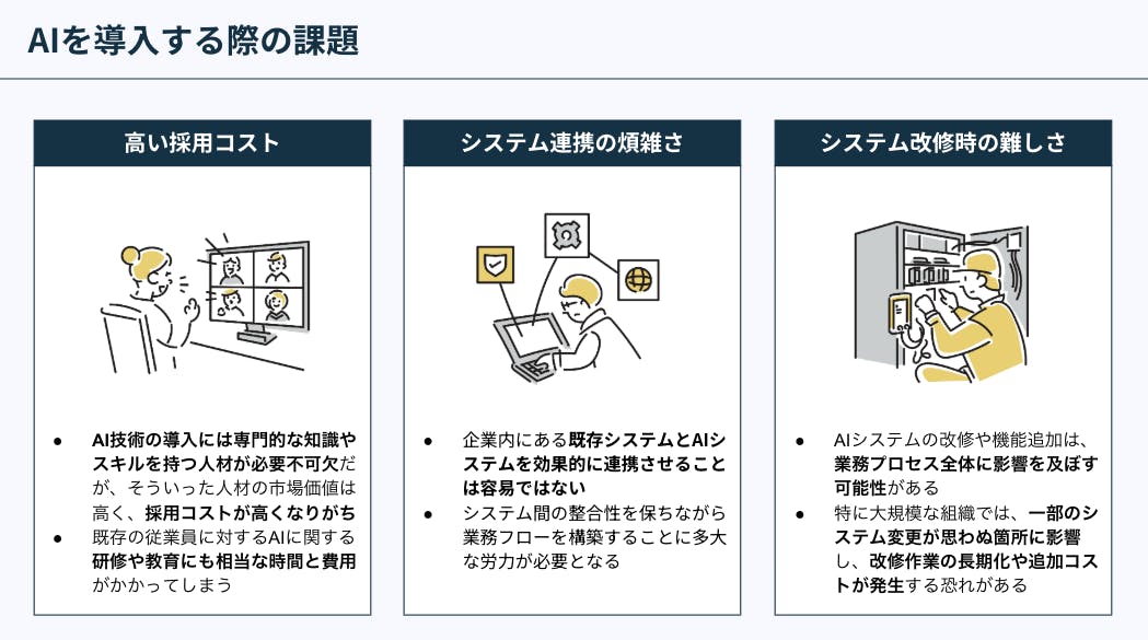 企業内ではすでに多くの基幹システムや業務システムが稼働しているという前提のもと、新たにAIシステムを導入する必要があります。これらの既存システムとAIシステムを効果的に連携させることは容易ではなく、システム間の整合性を保ちながら業務フローを構築することに多大な労力が必要となります。