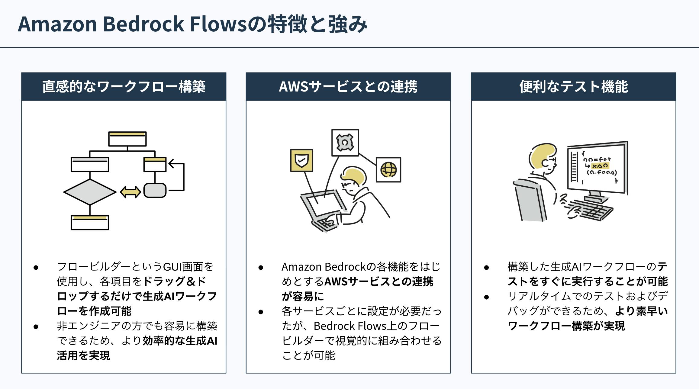 Amazon Bedrock Flowsは、最新の基盤モデルやAWSサービスを組み合わせた生成AIワークフローをノーコードで構築できるツールです。直感的な操作で生成AIアプリを作れるだけでなく、AWSサービスとのスムーズな連携やリアルタイムでのテスト・デバッグにも対応しています。