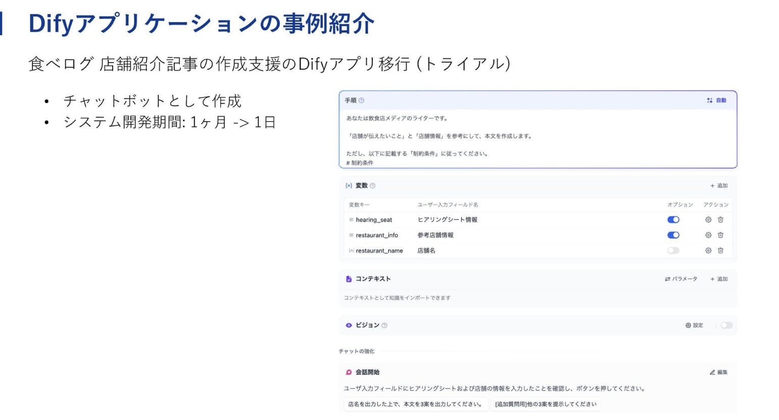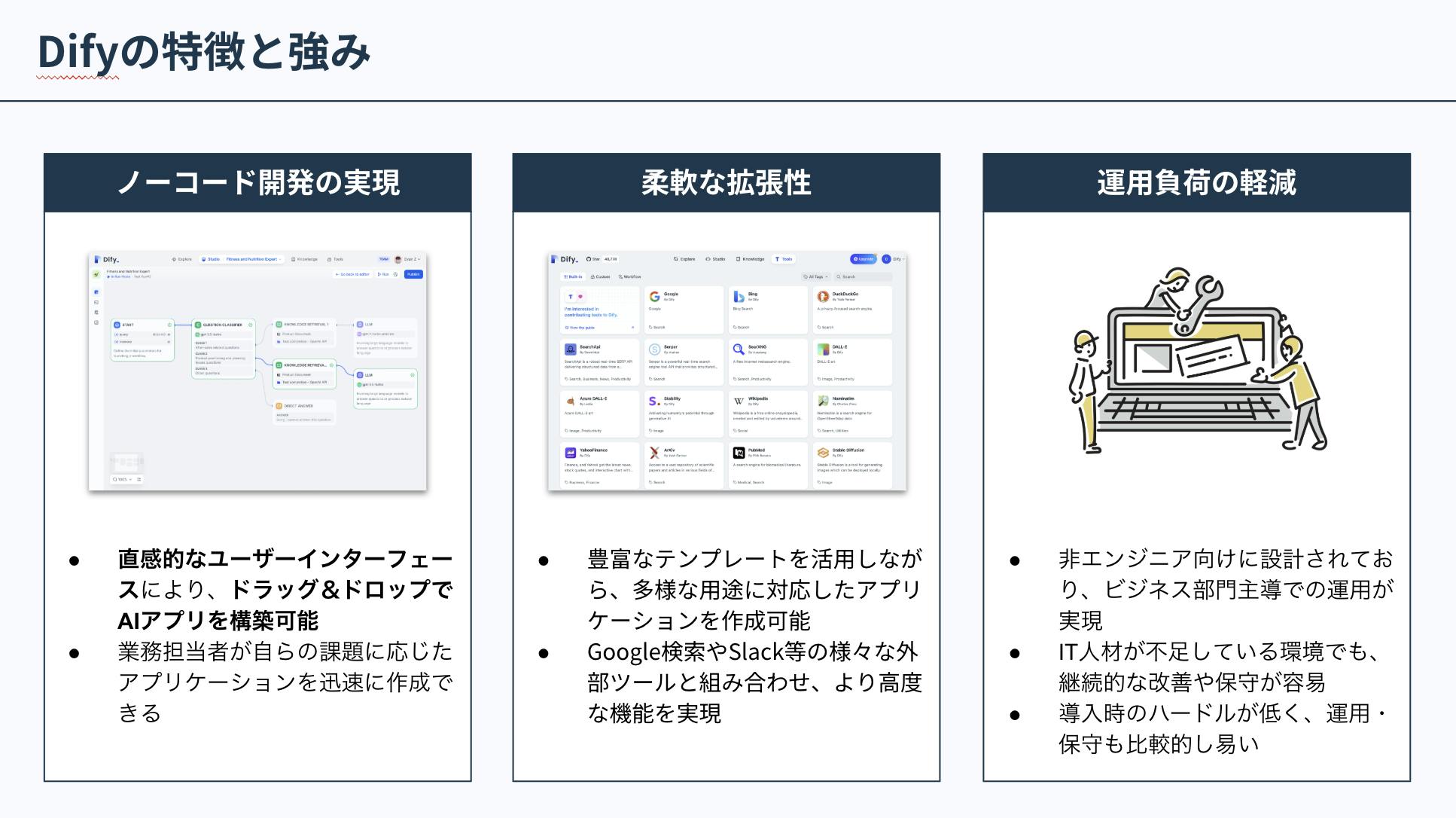 - Difyのナレッジベース機能を活用することで、その開発負担を抑えながら社内情報を効率的に共有できるチャットボットを構築