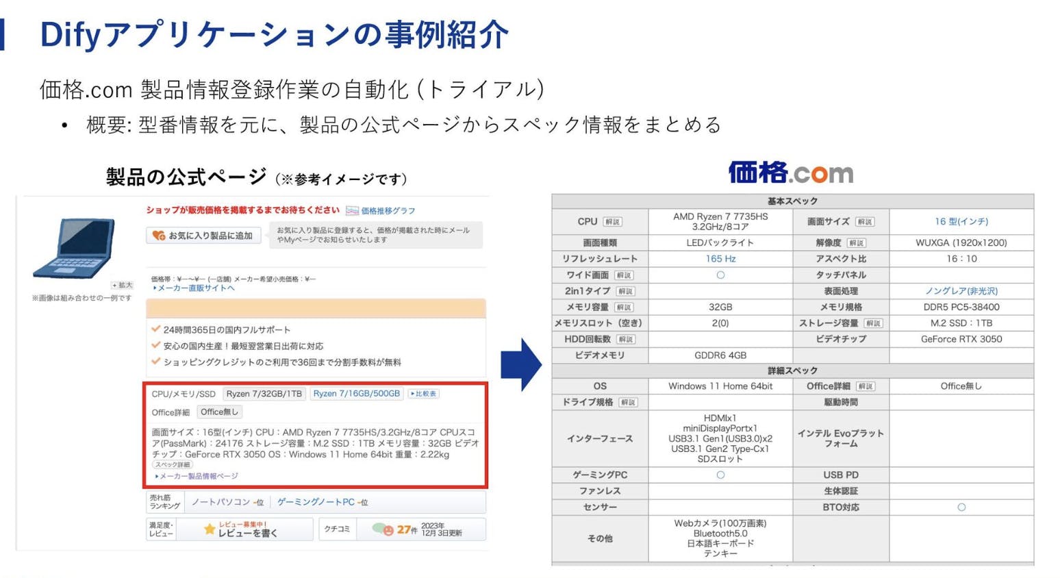 - 従来は公式サイトから商品のスペック情報を手動で収集・整理