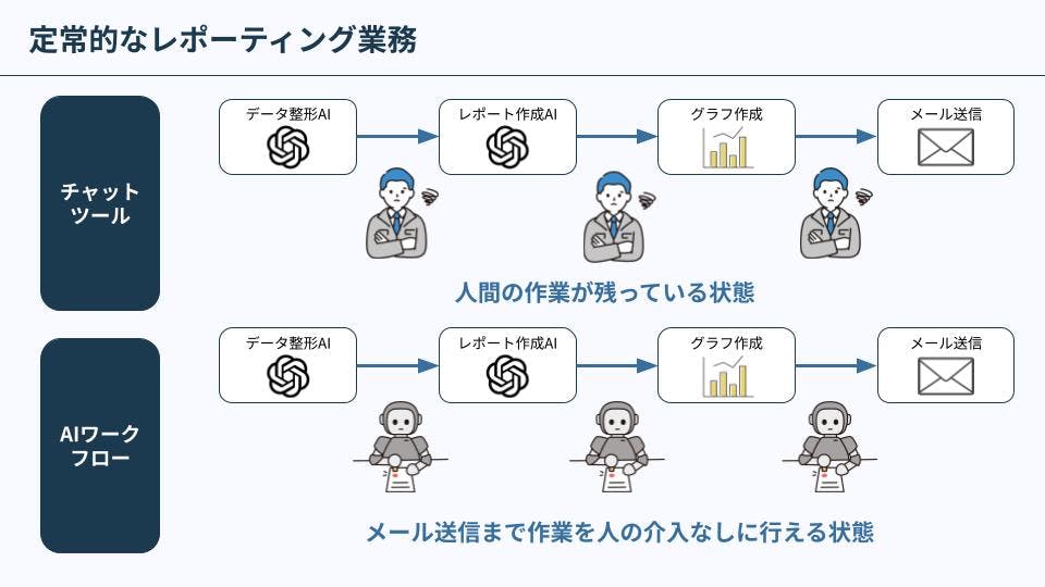 こういった例から分かる通り、単に一部の業務にAIを導入したり、社内システムとの連携を進めようとするだけでは根本的な業務効率化には至らないケースが多いです。そこで注目されているのが、複数のサービスとAIとの連携が容易で業務”全体”をAIが実行することができる「AIワークフロー」という新しいアプローチです。詳しくみていきましょう。