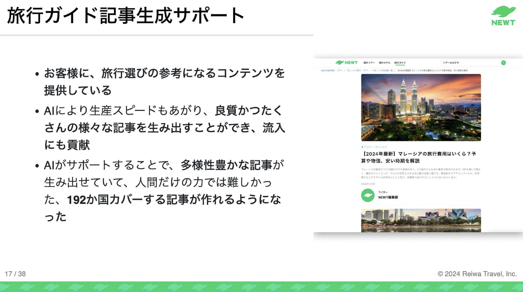 海外旅行予約アプリ「NEWT」の運営を手がける令和トラベルでは、AIを活用した業務改革に取り組む中で、特に長文生成の品質問題に直面していました。この課題に対して、AIワークフローを導入し、旅行ガイドやツアータイトル作成の自動化や社内向けチャットボットの開発等を通じて業務改革を実現しました。