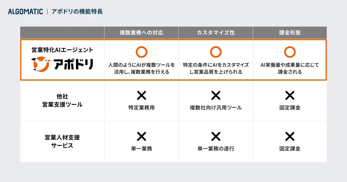 Algomaticが提供する「アポドリ」は、営業AIエージェントの日本における最先端の事例です。アポドリは、以下の特徴を持っています。