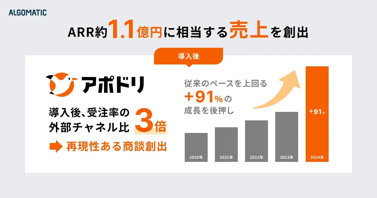 実際に2024年7月にアポドリを導入したA社では、エンタープライズセールスにおいてARR約1.1億円に相当する売上を創出していることに加え、本格的な活用開始からわずか6カ月で新規MRRの約20%を達成しており、対前年比191%ペースでの成長に貢献しています。