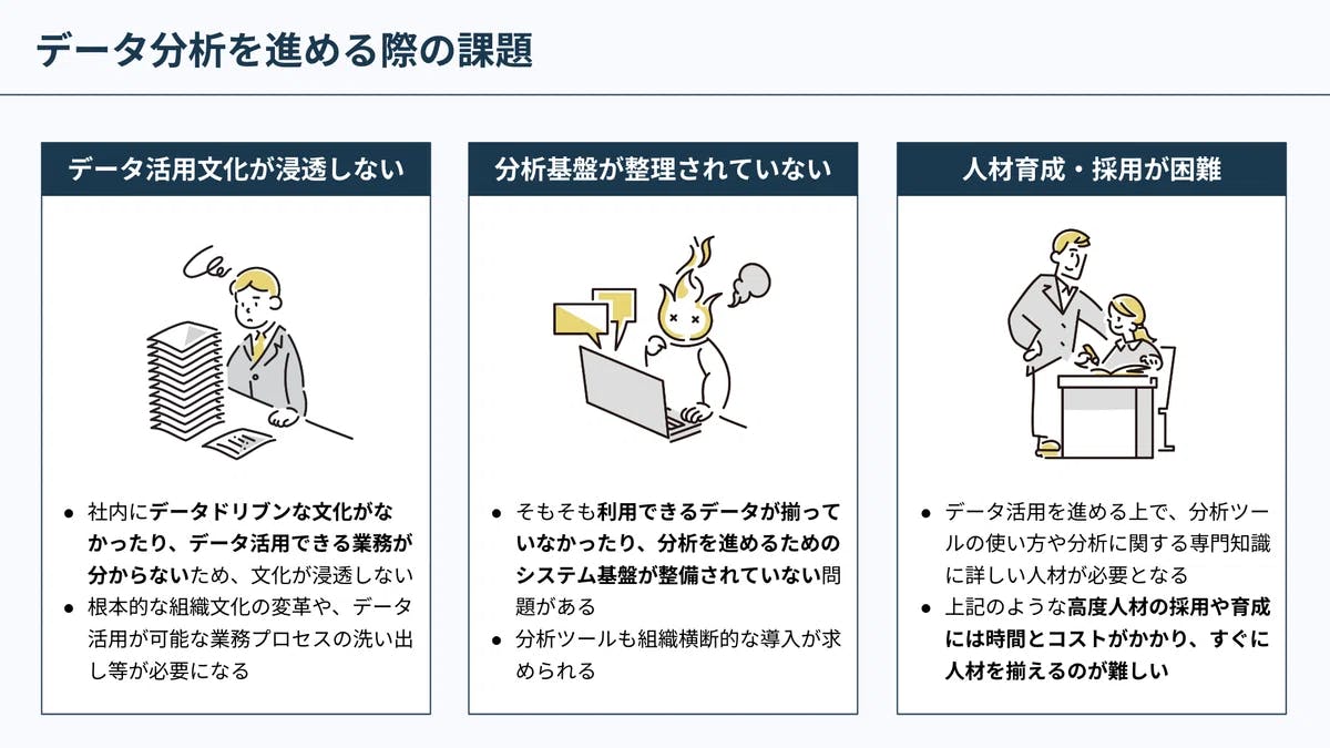 企業がデータ活用を進める際、どのような課題に直面しているのでしょうか。大きく分けて、組織、分析基盤、人材の3つの観点から整理していきます。