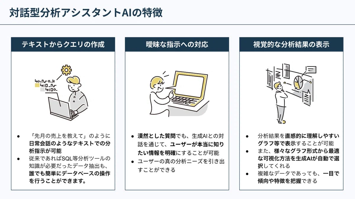 「先月の売上を教えて」や「週末と平日の購入平均額を比較して」といった日常会話のようなテキストでの分析指示が可能です。従来であればSQLの知識が必要だったデータ抽出も、生成AIがテキスト内容を理解し、適切なクエリに変換することで、誰でも簡単にデータベースの操作を行うことができます。