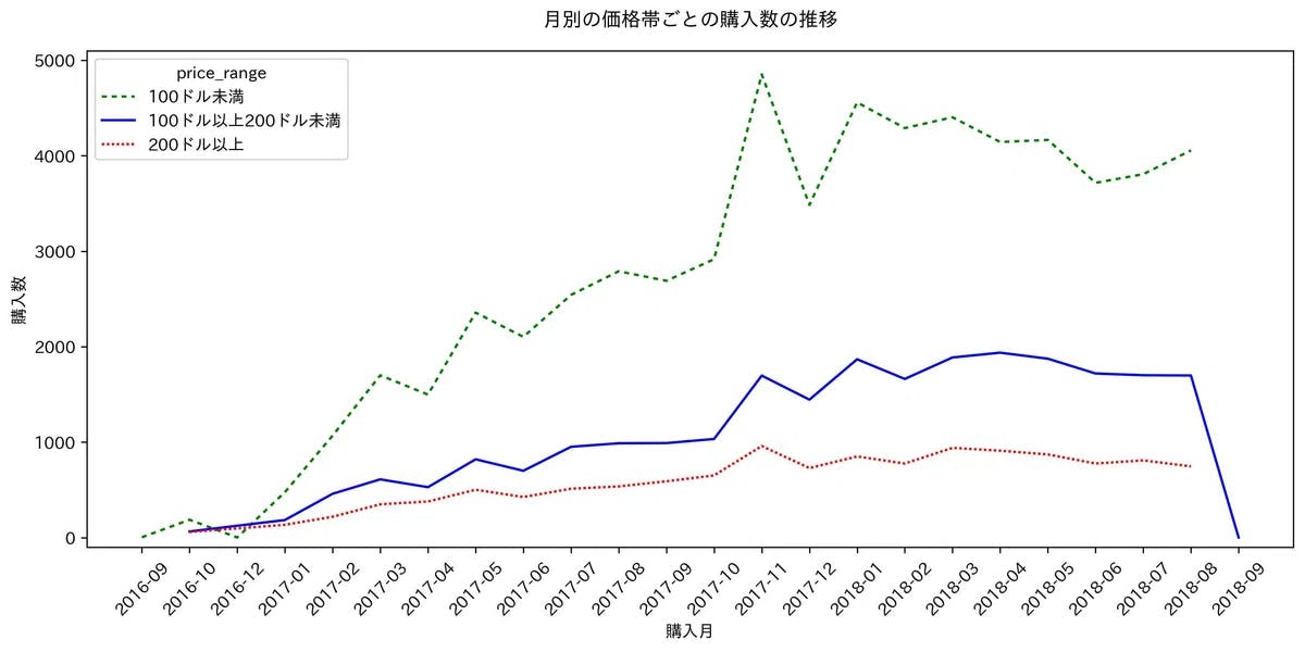 出力された上記のグラフから、2017年12月の低価格帯(100ドル未満)の商品の購入数が、中・高価格帯(100ドル以上)の商品に比べて特に落ち込んでいることが分かりました。