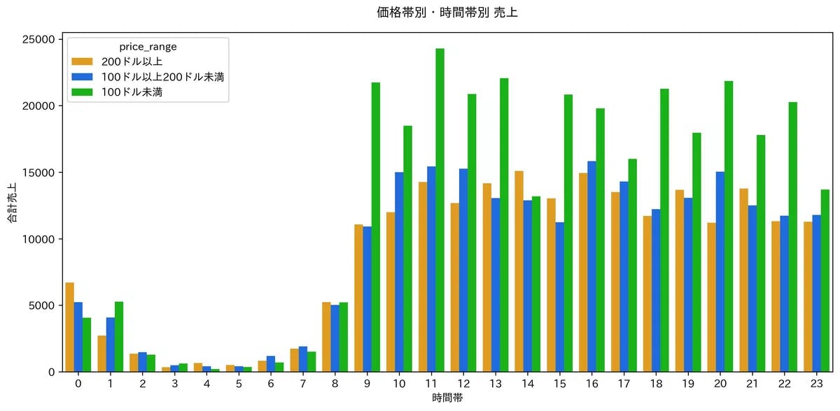 グラフを見ると、低価格帯(100ドル未満)商品の売上が、特に0時台および14時台において他の価格帯と比較して大きく下回っていることが確認できます。