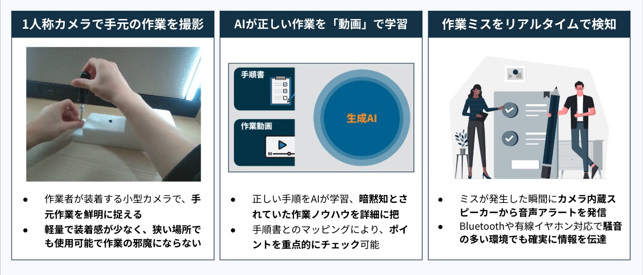 本システムの最大の特徴は、ミスをリアルタイムで検知し、即座にフィードバックできる点です。作業ミスが発生した瞬間に、カメラ内蔵されたスピーカーから音声アラートが発せられます。