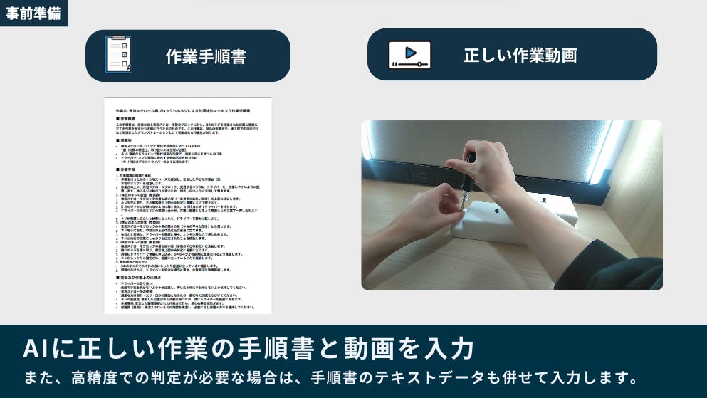 熟練作業者による正確な作業を撮影し、基準となる動画データを作成します。また、高精度での判定が必要な場合は、手順書のテキストデータも併せて入力します。