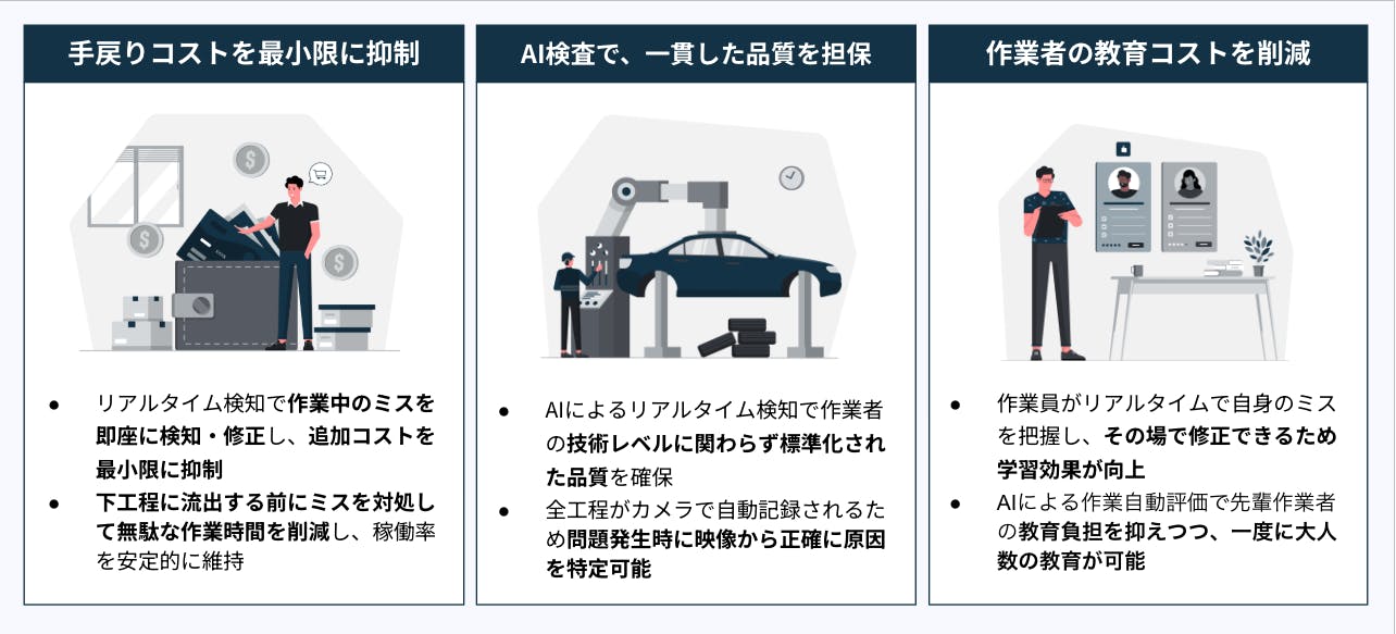AIによるリアルタイムの人為ミスの検知により、作業者の技術レベルに関わらず、標準化された品質を保つことができます。
