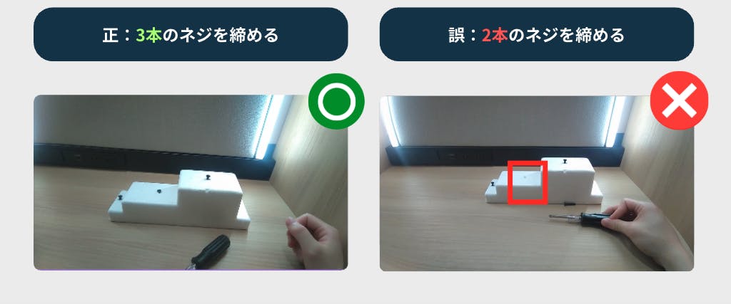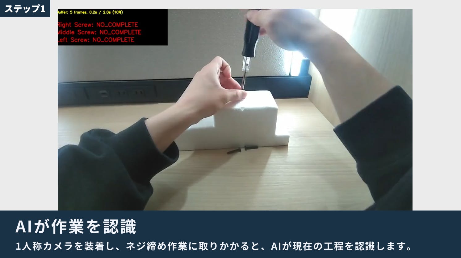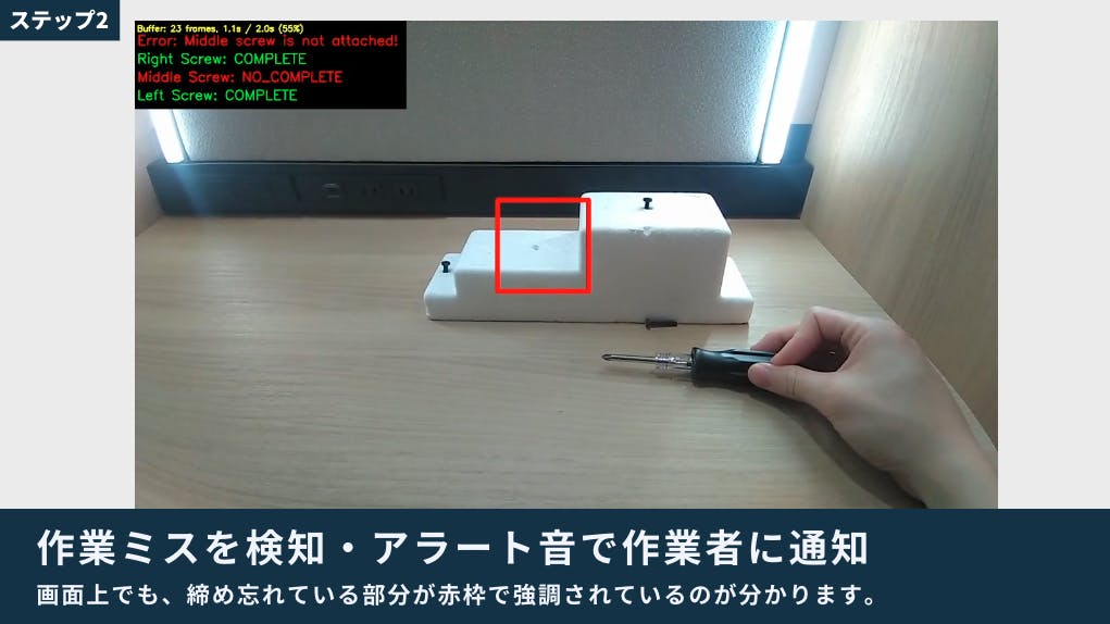 このデモでは、AIが作業者のネジの締め忘れを検知し、アラート音で作業のミスを指摘して修正を促します。