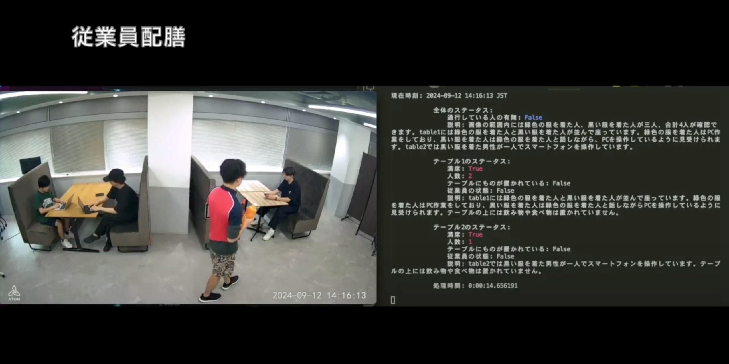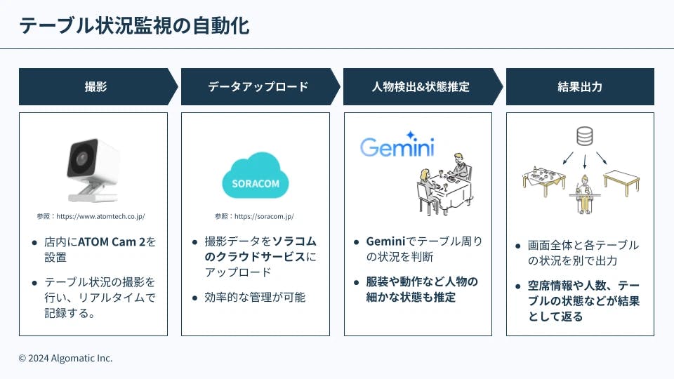 クラウドに送信されたデータを解析して、Gemini 1.5 proがテーブル周りの状況(空席・満席、人数、物の有無、従業員の動きなど)をリアルタイムで判断します。 - 結果の出力: