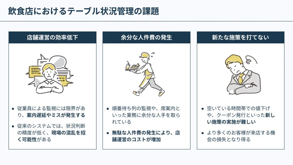 - 従業員による監視には限界があり、リアルタイムでのテーブル状況把握ができず、新規客の案内遅延や案内ミスが発生します。