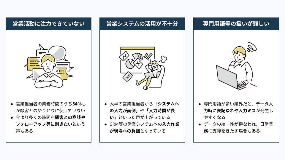 さらに、業界によっては、専門用語が多かったり、複雑な商品名が多数ある商材を扱っていたりします。こうした場合、報告書の作成やCRM等のシステムへのデータ入力時に表記ゆれや入力ミスが発生しやすくなるという問題があります。