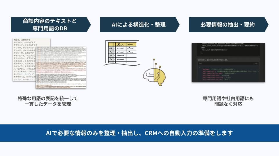 通常、営業の会話にはアイスブレイクや雑談など商談内容とは直接関係のない話題も含まれます。そこで、AIが録音データを解析して、商談の要点や必要な情報を抽出することで、CRMへの効率的な自動入力への準備ができます。