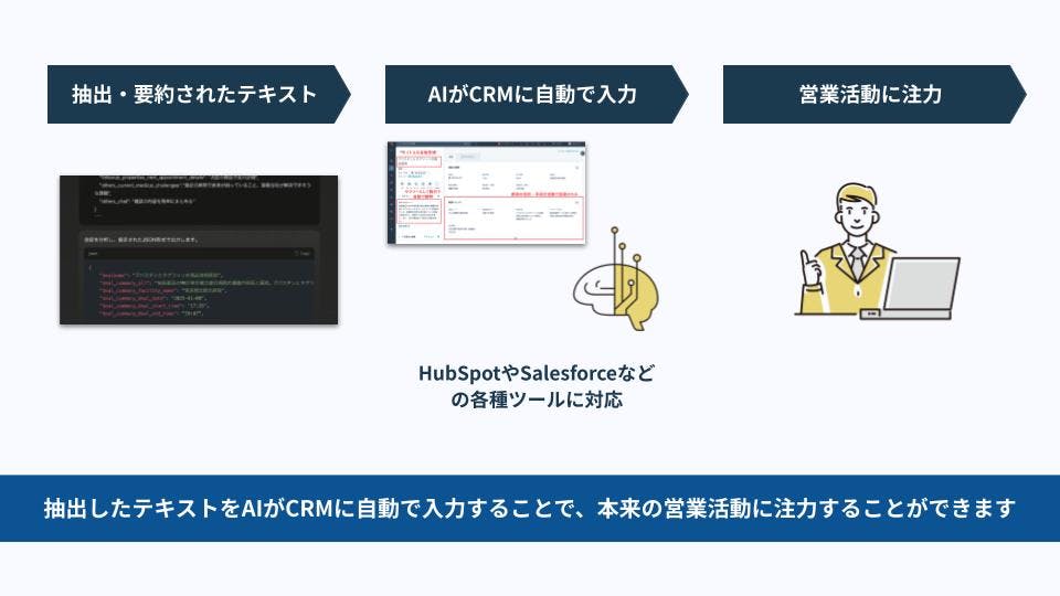 AIにより構造化されたデータをHubSpotやSalesforceをはじめとするCRMへ自動入力します。ここでも、営業担当者が手作業でデータを入力する手間がなくなるため、余計な事務作業を減らせるだけでなく、本来の営業活動に注力できるようになります。