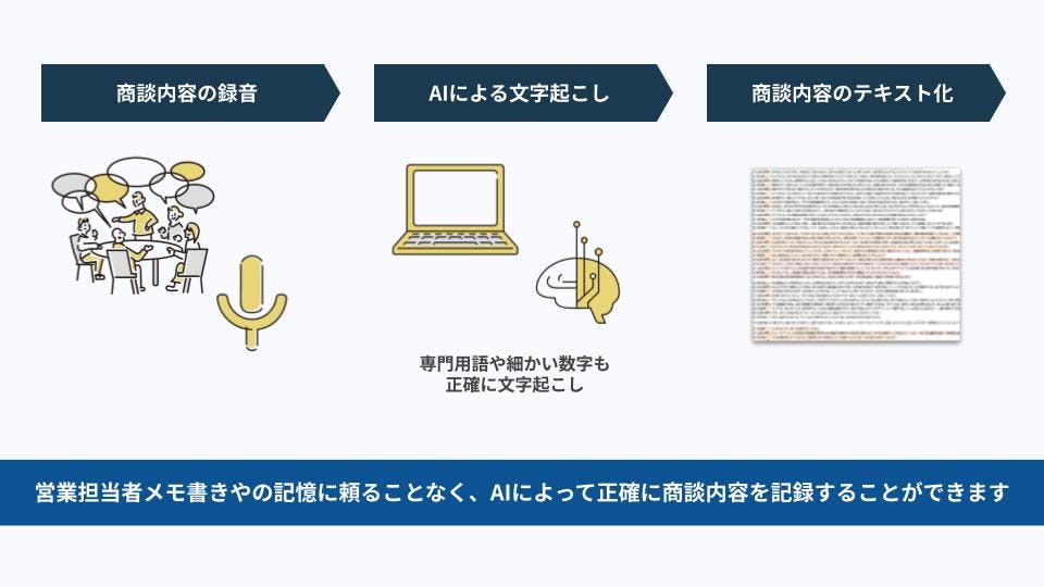 商談や打ち合わせの録音データに対して、AIが自動的に文字起こしを行います。これにより、営業担当者が手作業で記録を行う必要がなくなり、業務効率を大幅に向上させることができます。