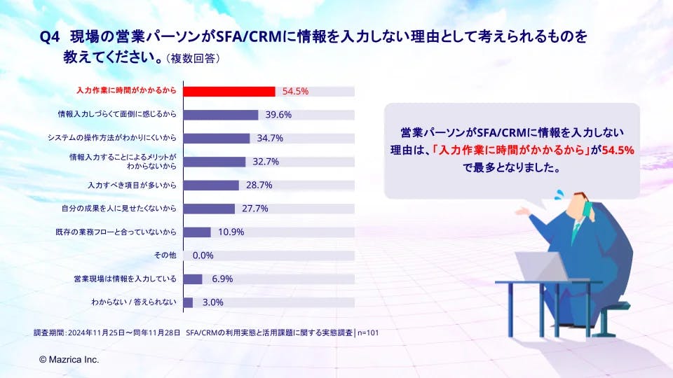 冒頭で、多くの企業がCRMやSFAを導入したものの、十分に活用できていないという課題があると説明しました。その主な要因は、データ入力の複雑さや所要時間の長さにあります。