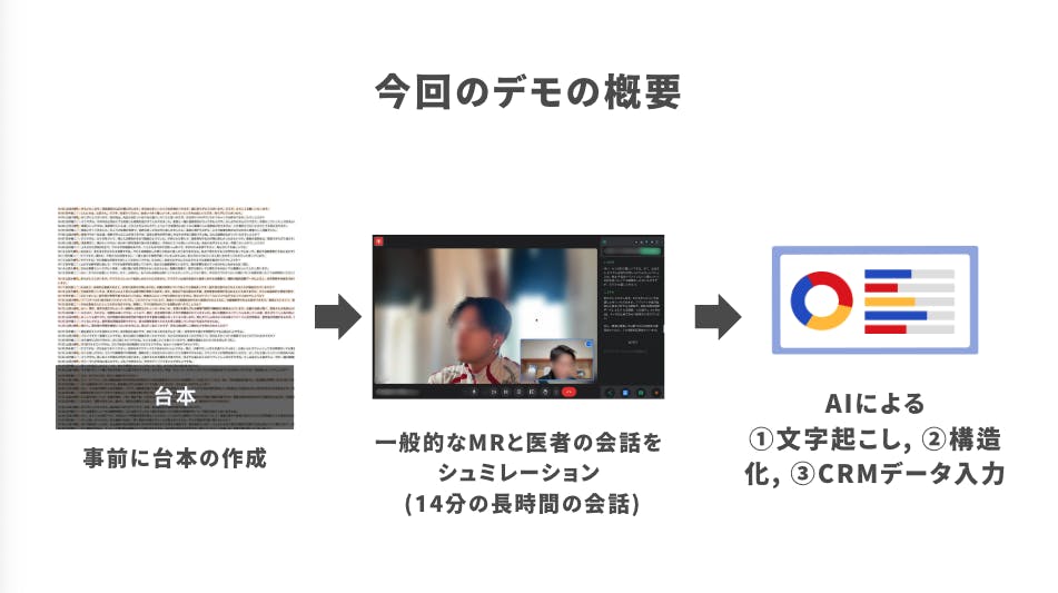 先ほど紹介した弊社の「CRM自動入力ソリューション」のデモを紹介していきます。今回はMR(医薬情報担当者)を対象としており、事前に用意した台本をもとに、一般的なMRと医者の会話を想定しています。