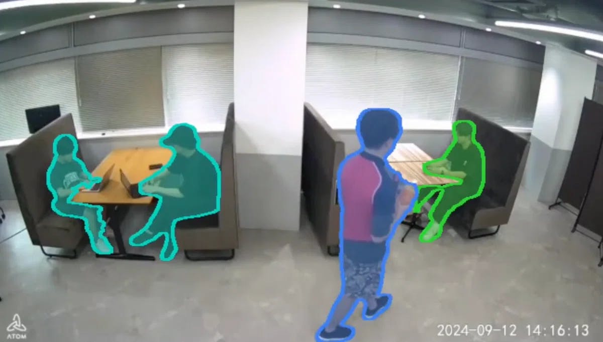 デモ動画では、席に座っている人と歩いている人をそれぞれ検知かつ追跡できている様子が確認できます。また、人物が重なった場合でも、SAM2はその背後にいる人物を見逃すことなく追跡し続けることができています。