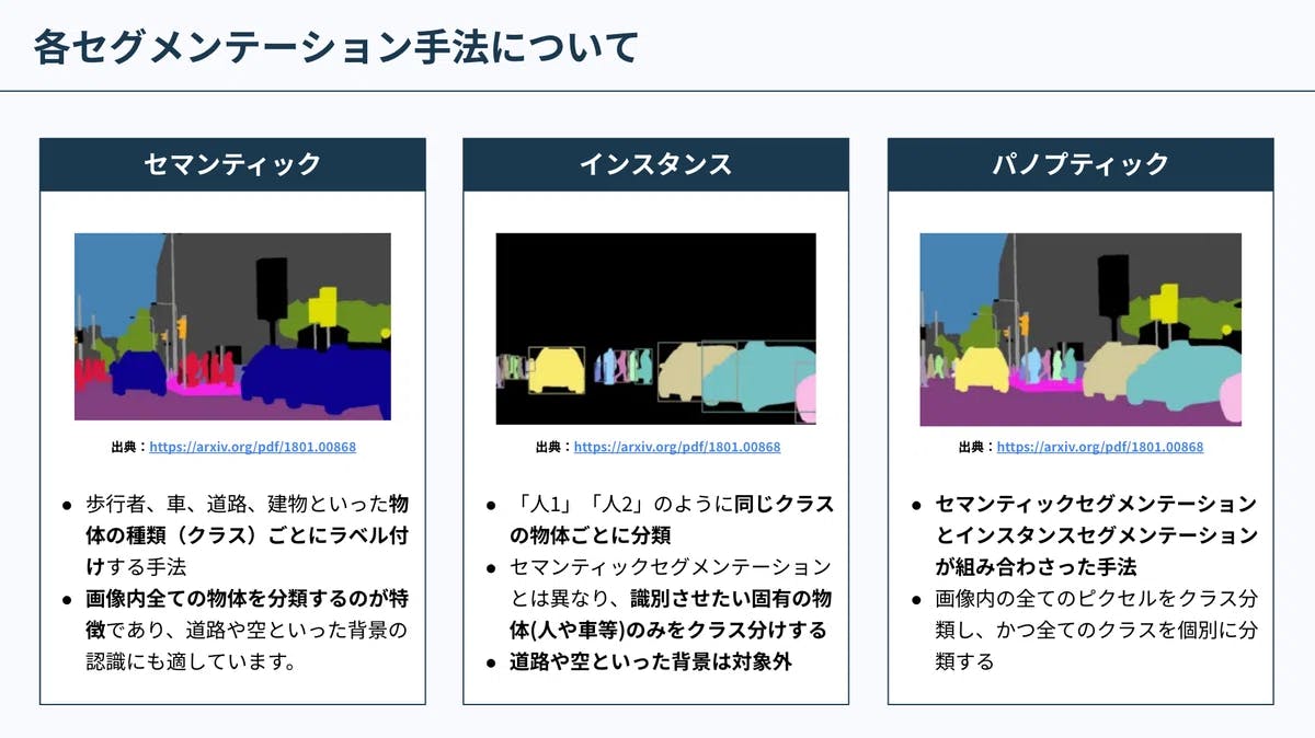 セグメンテーション手法には主に、セマンティックセグメンテーション、インスタンスセグメンテーション、パノプティックセグメンテーションの3種類があります。それぞれの特徴は以下の通りです。