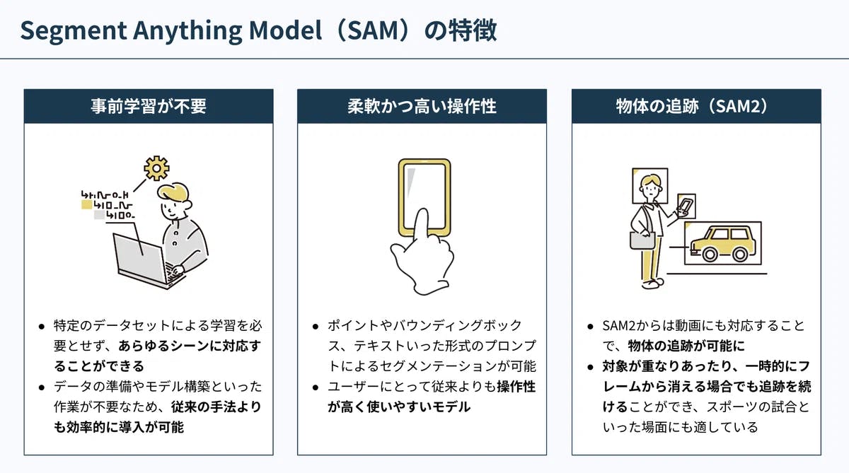 SAMは従来の3種類のセグメンテーションとは異なる新しい手法で、事前学習不要、点や領域指定による柔軟かつ高い操作性が特徴です。また、最新モデルのSAM2は動画対応により物体の追跡も可能になりました。