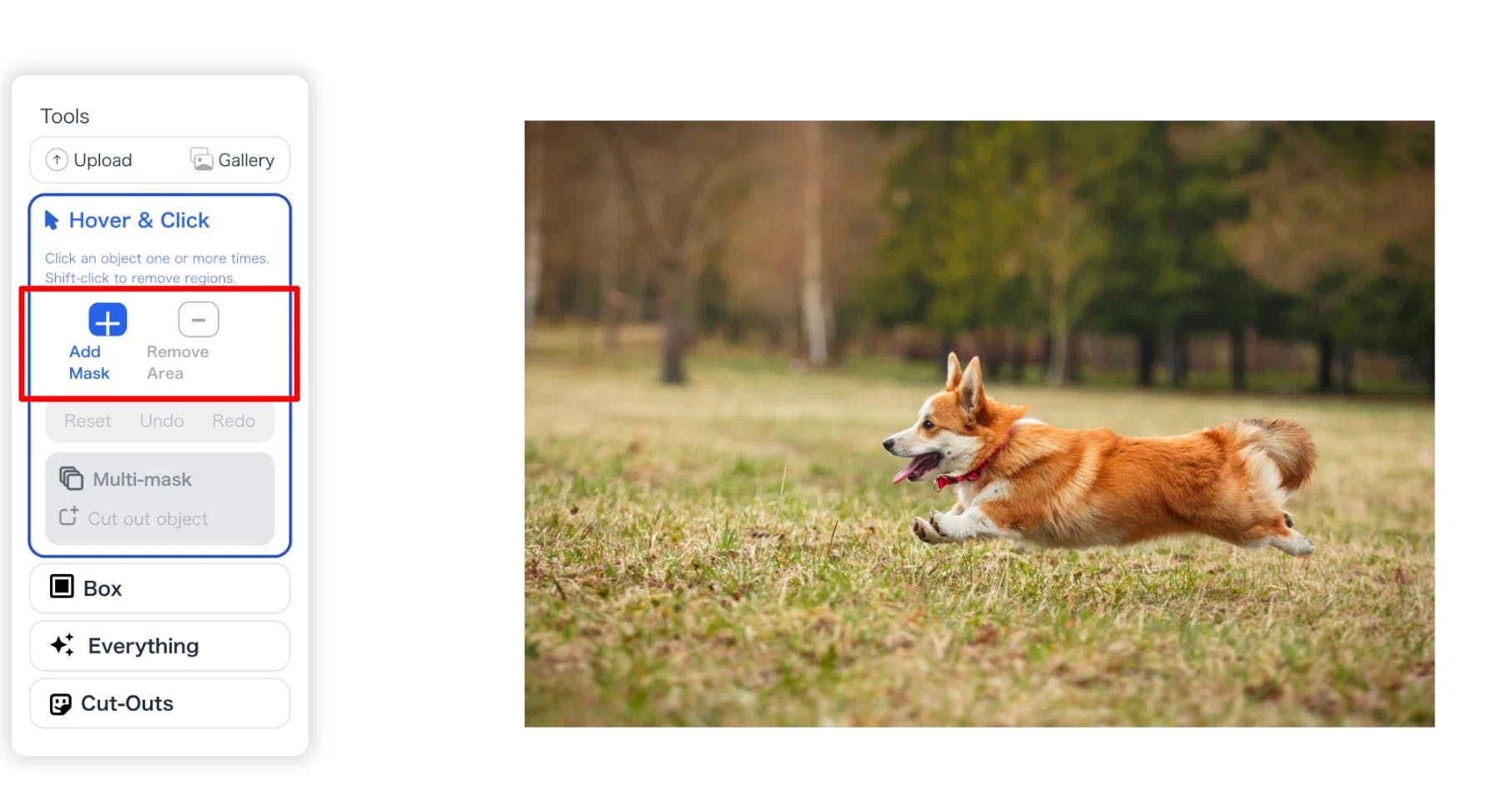 1.デモページにアクセスし、物体を選んでセグメンテーションを行うAdd Mask機能を選択