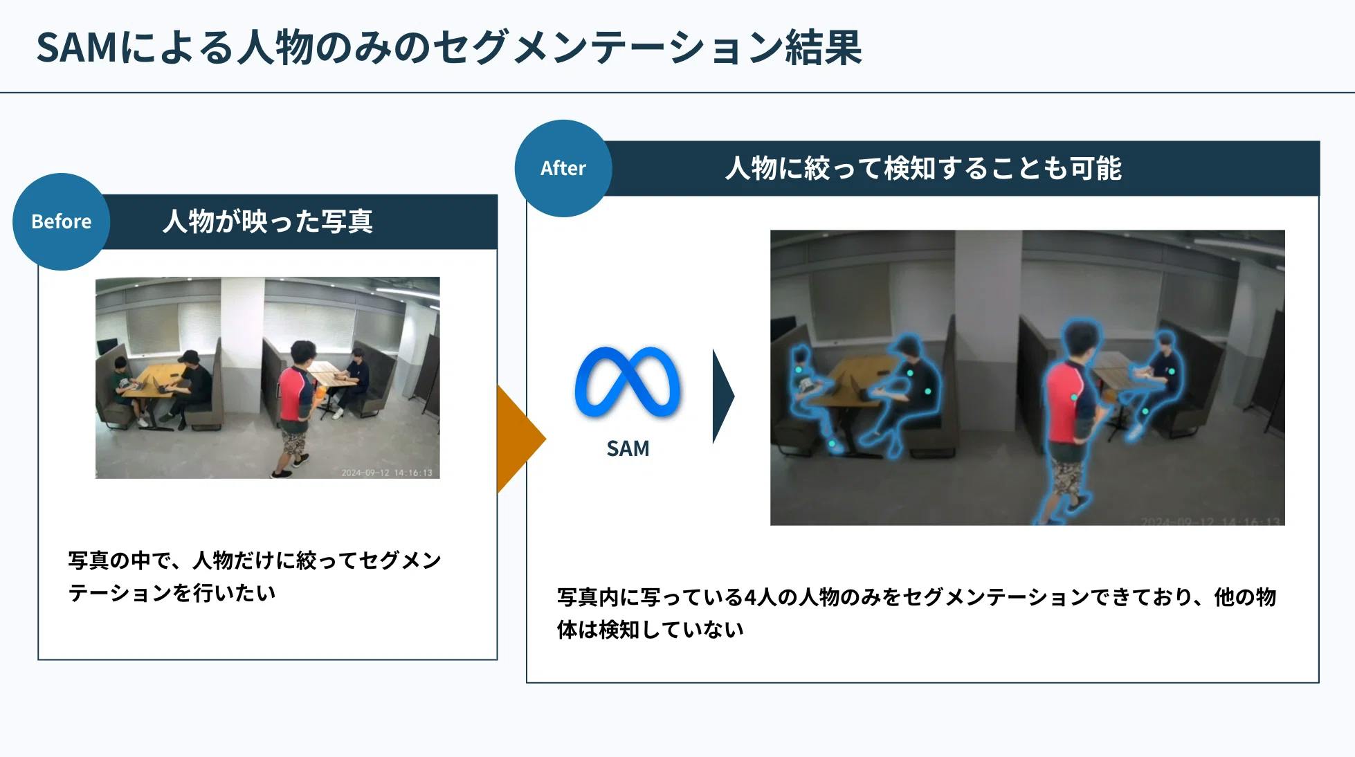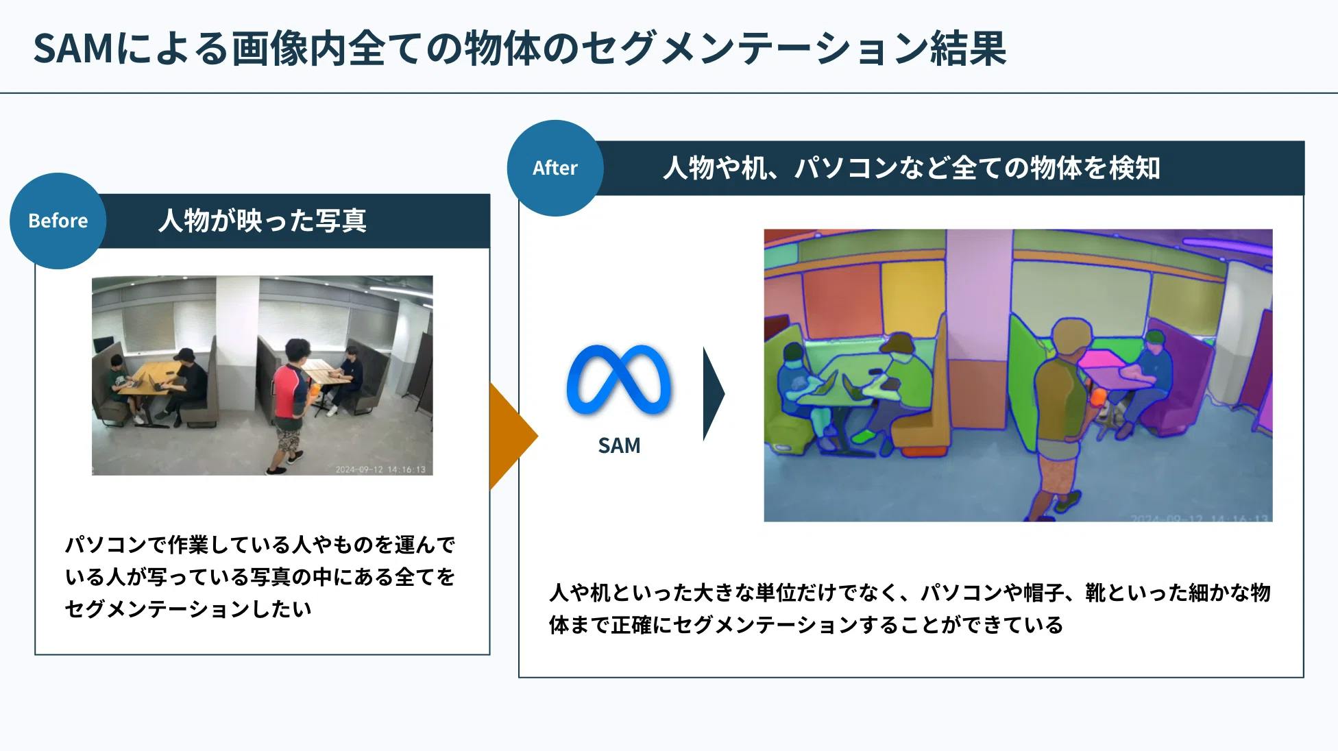 IoTカメラと生成AIを用いた弊社のソリューションでは、テキスト形式でカメラに写っている状況を説明していました。そのため、人が一目で状況を把握するのは難しかったのですが、SAMを使うことで視覚的にわかりやすい画像形式で状況を出力できるため、即時かつ直感的な状況把握が可能となります。