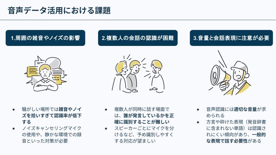 音声データの活用範囲は急速に広まっていますが、いくつかの課題が存在します。主な課題として、以下の3つが挙げられます。
