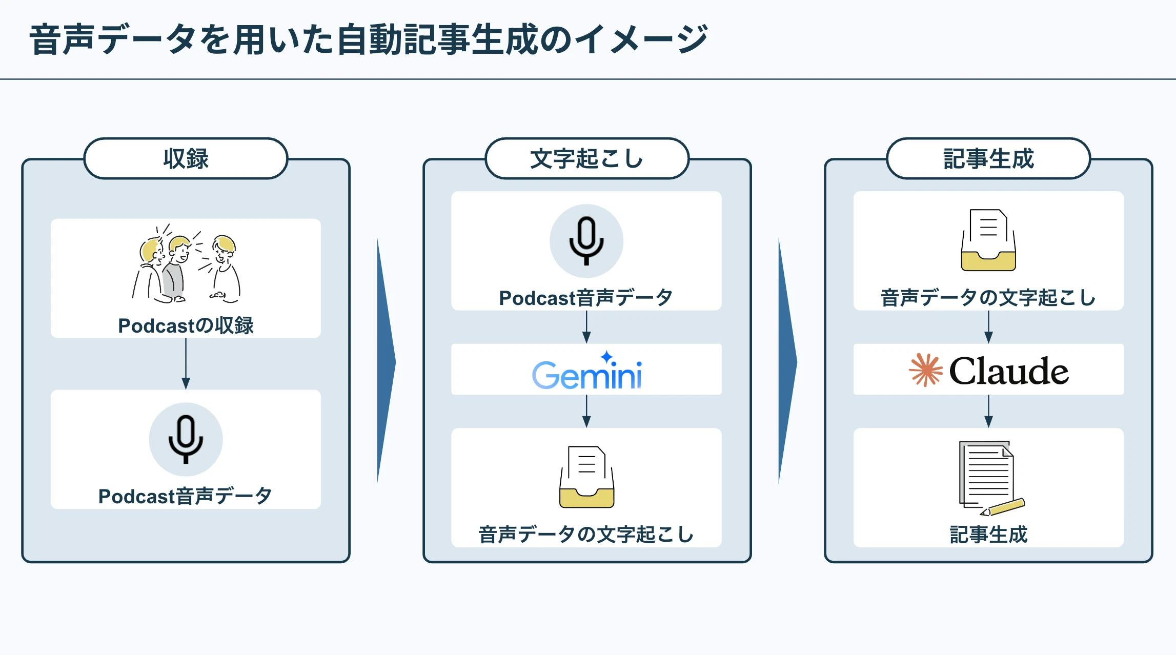 冒頭で述べたように、弊社は生成AI技術を活用して音声データの効率的な解析とコンテンツ化を実現しています。その一例として、複数話者のポッドキャスト内容を自動で記事化するプロセスを構築しました。