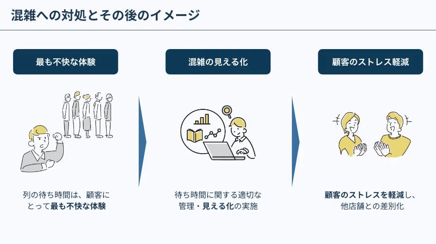 このような状況では、待ち時間が明確でないため顧客が他の店舗へ行ったり、人件費の無駄やサービス品質の低下を引き起こしたりするなど、他店への流出や店舗サービスの遅延などを招く恐れがあります。