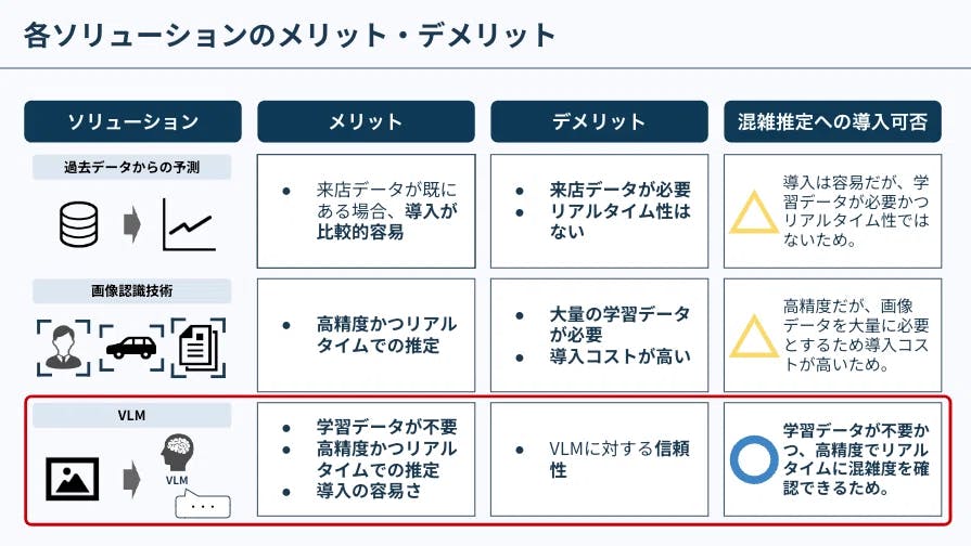 また、過去データからの予測では対応が難しかったり、画像解析の開発コストが高いため導入まで至らなかったりする場合、VLMはそれらの代替手段として有効に利用できるツールであり、混雑把握に関するAI導入への一歩となり得るのではないでしょうか。