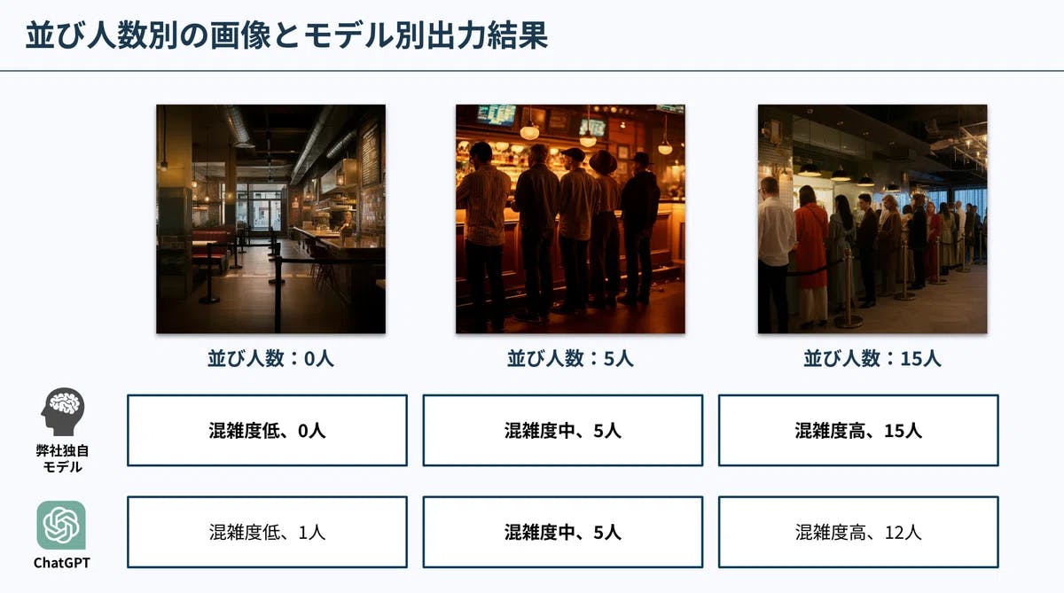 これらの手法の中でも、VLMは特に導入が簡便でありながら高い精度を誇るため、店舗における混雑度の推定において非常に有効となり、今回デモのツールとして採用しました。